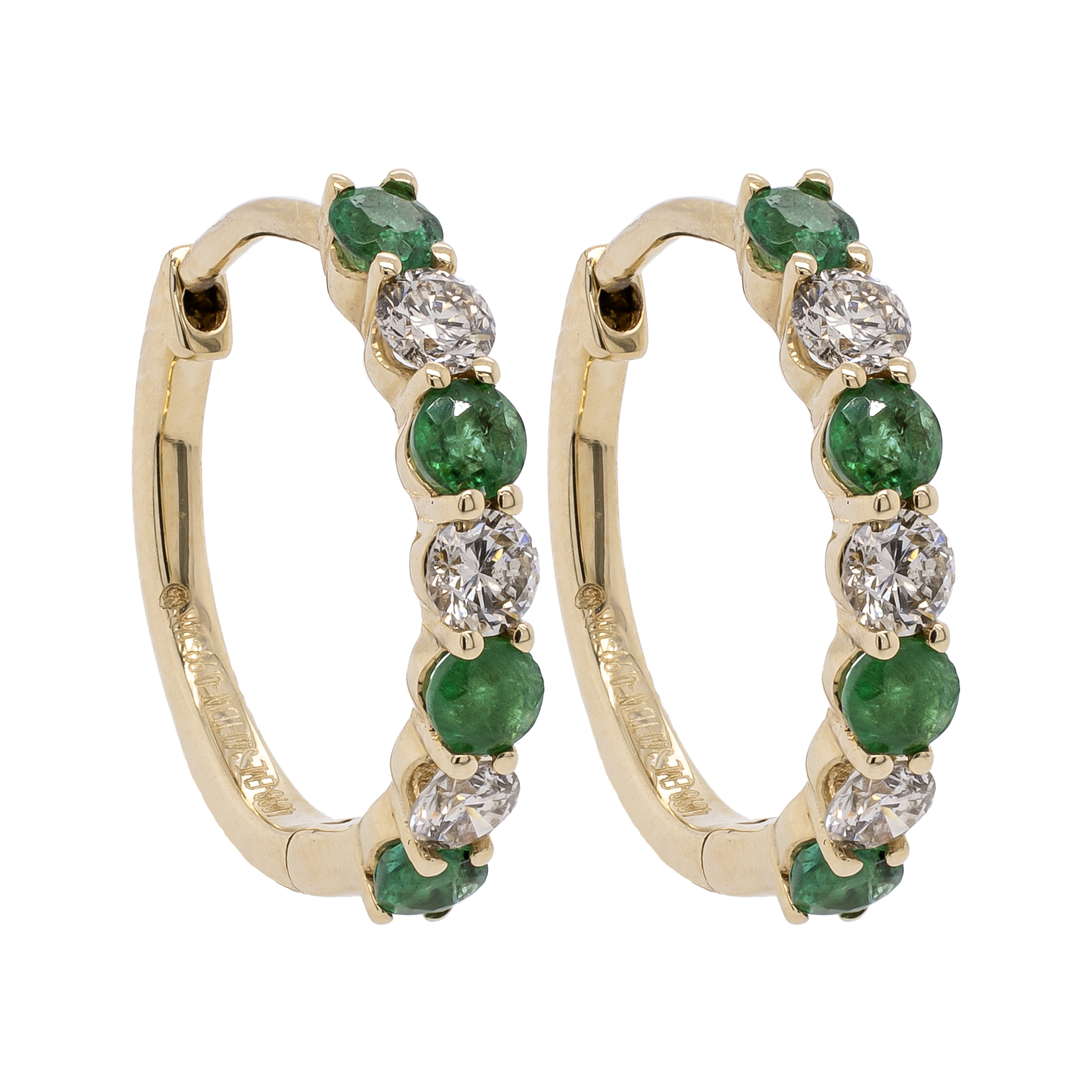 14K Yellow Gold Emerald Diamond Hoop Earrings